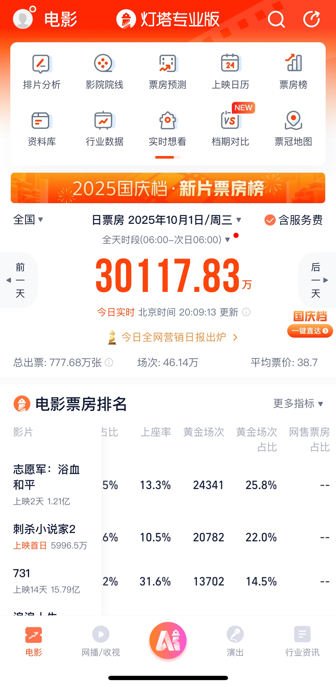 据灯塔专业版数据,2025年国庆档首日票房破3亿元。《志愿军:浴血和平》《刺杀小说家2》《731》《浪浪人生》《三国的星空第一部》暂列当日票房前五名。