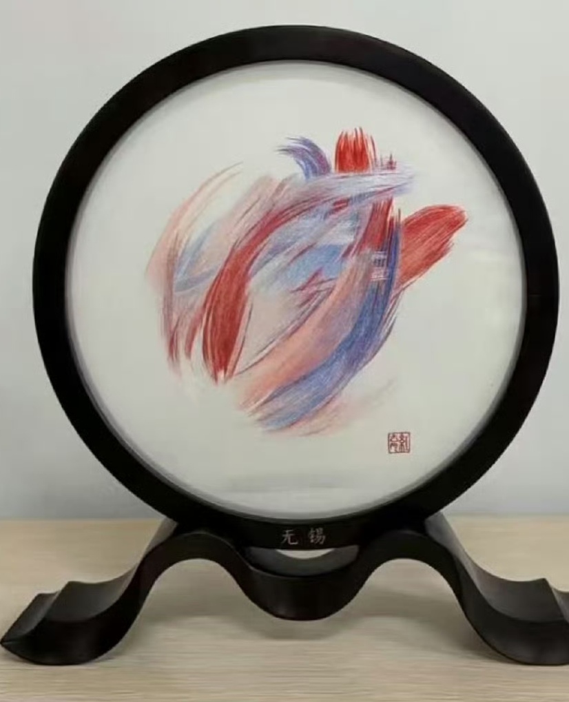 把《光点》化为双面精微绣作品,在工艺上极具挑战性,其当代美术风格更让这场非遗演绎成为一次创新尝试。赵红育在采访中坦言,这与自己以往擅长的传统题材截然不同:“我们熟悉的锡绣多表现江南山水、古典人物这类中国画风格的题材,线条和意境都偏含蓄悠远。但《光点》是典型的当代美术风格,它的视觉语言很直接,没有传统绘画的程式化表达,这对刺绣转化来说是全新的课题。”