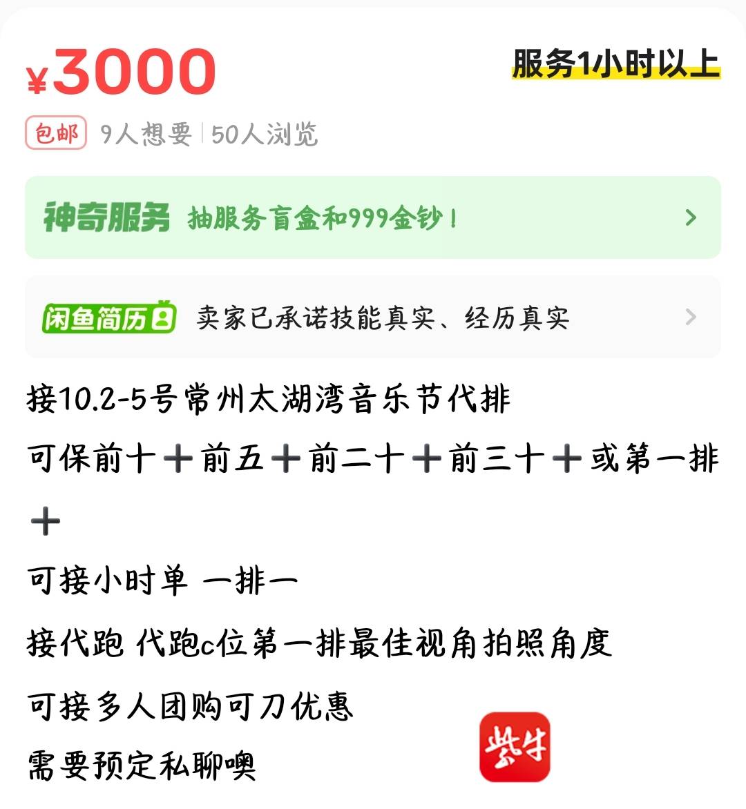 夜排大军并不全部都是粉丝,其中还有“黄牛”盯上了这门生意,在二手平台上可以搜索到大量“代夜排”“出前排位置”的商品,通常按小时收费,大多每小时在十元、二十元上下,部分特别热门的音乐节代夜排价格会更高。直接出前排位置的也有,部分价格在千元以上。为了避免跑单,大多“黄牛”会要求买家预先支付定金,这之中被骗钱的人也不少,卖家失联的情况最为常见,大多损失一两百元,亦很难追讨。