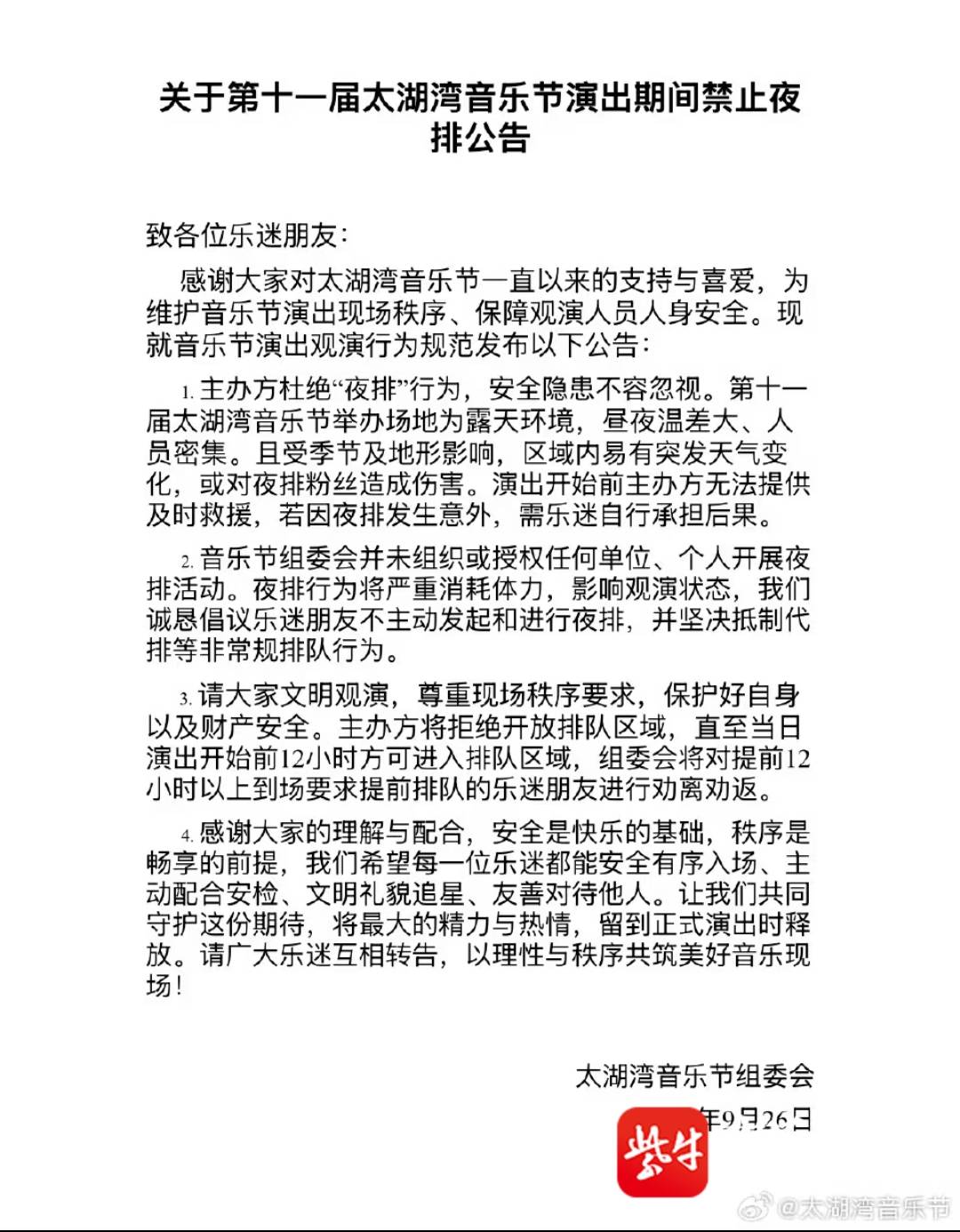 值得注意的是,在国庆开始前,已有部分音乐节主办方发文禁止夜排了,今年太湖湾音乐节场外出现了不少艺人梓渝的夜排粉丝,因夜排存在一定程度的安全隐患,9月27日太湖湾音乐节曾发布公告,禁止粉丝夜排,梓渝所属公司瑞鹤娱乐也在音乐节前发文,要求粉丝不要夜排。不过这样的发文和倡议并没有让夜排军们收手,仍有夜排粉丝晒出了夜排现场,当其他网友问:“不是说不让夜排吗,都发公告了。”有粉丝回应:“那就是个免责声明,要怎么做是消费者的自由。”