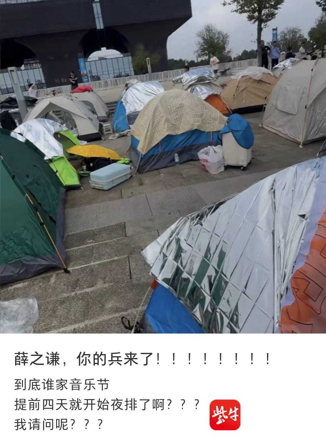 记者注意到,国庆期间举办的多个热门音乐节都出现了夜排,其中部分邀请了热门艺人的音乐节出现了规模相当惊人的夜排大队,9月27日已有网友晒出了不少人已经在天生桥音乐谷外扎帐篷准备夜排,并配文“薛之谦你的兵来了!”当时评论区中就有网友表示,薛之谦说过很多次粉丝不要夜排,“自我感动,老薛都说过不要夜排,不要夜排。”