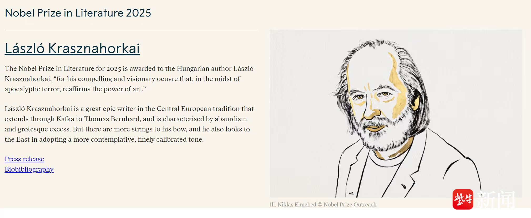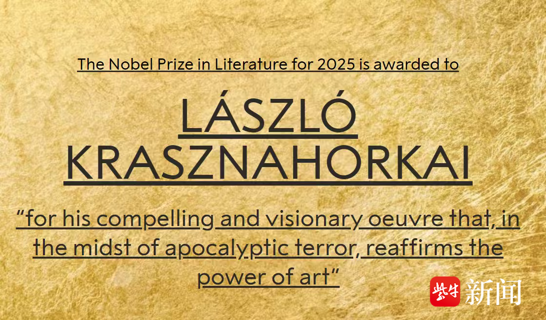 北京时间10月9日晚19点整,2025诺贝尔文学奖在斯德哥尔摩公布。匈牙利作家克拉斯诺霍尔卡伊·拉斯洛(László Krasznahorkai 匈牙利人姓名采用由姓氏和名字构成的两节结构,其排列顺序为姓在前、名在后,与东亚命名传统一致,在欧洲范围内属于独有特征。)获得诺贝尔文学奖。