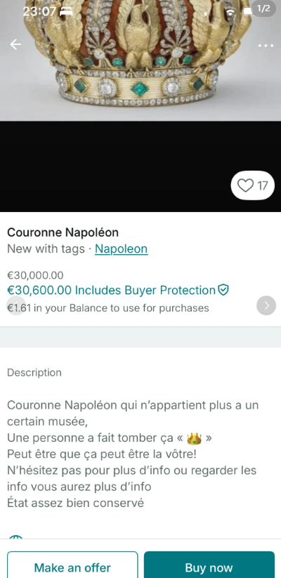 自从10月19日法国卢浮宫公告有8件具有“无法估量历史价值”的法国王室珍藏珠宝被盗后,一连串的连锁反应正在互联网上酝酿起风暴。当法国文化部、巴黎市政府、巴黎警方和卢浮宫正在为追捕盗贼焦头烂额之际,已经有“嗅觉敏锐”的商家看到了这起文物浩劫事件中的“商机”。