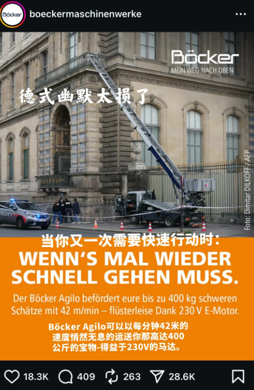 但值得注意的是,这种“抽象”行为不止是出现在国内,法国的二手服饰交易软件vinted上也出现了“卢浮宫博物馆被盗珠宝”售卖链接,平台方对此做出的回应也类似,闲鱼客服表示平台大数据在监测中,用户看到可以举报,人工专员会审核处理。vinted的公关人员对法国媒体回应称这些都是虚假广告,会进行处理。更叫人哭笑不得的是,制造此次失窃案中的窃贼使用的升降梯的德国公司也借机做起了营销:“当又一次需要迅速行动时,能以每分钟 42 米的速度,运送重达400公斤的珍贵货物。”配图是出现在卢浮宫失窃现场的升降梯。
