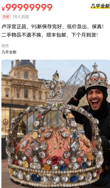 万里之外的国内电商平台上已经火速上架了卢浮宫失窃珠宝的同款,既有售价几千元的欧仁妮皇后蝴蝶结钻石胸针同款,也有只需要16元就能拿下的玛丽·路易斯皇后祖母绿首饰套装。还有一些网友开始在二手交易平台上玩抽象了,前几日,闲鱼上出现了多个“卢浮宫博物馆被盗珠宝”售卖链接,标价从99万元到9999万元不等,链接文案中还有“95新,现货在手、刚取货,低价急出”等描述。