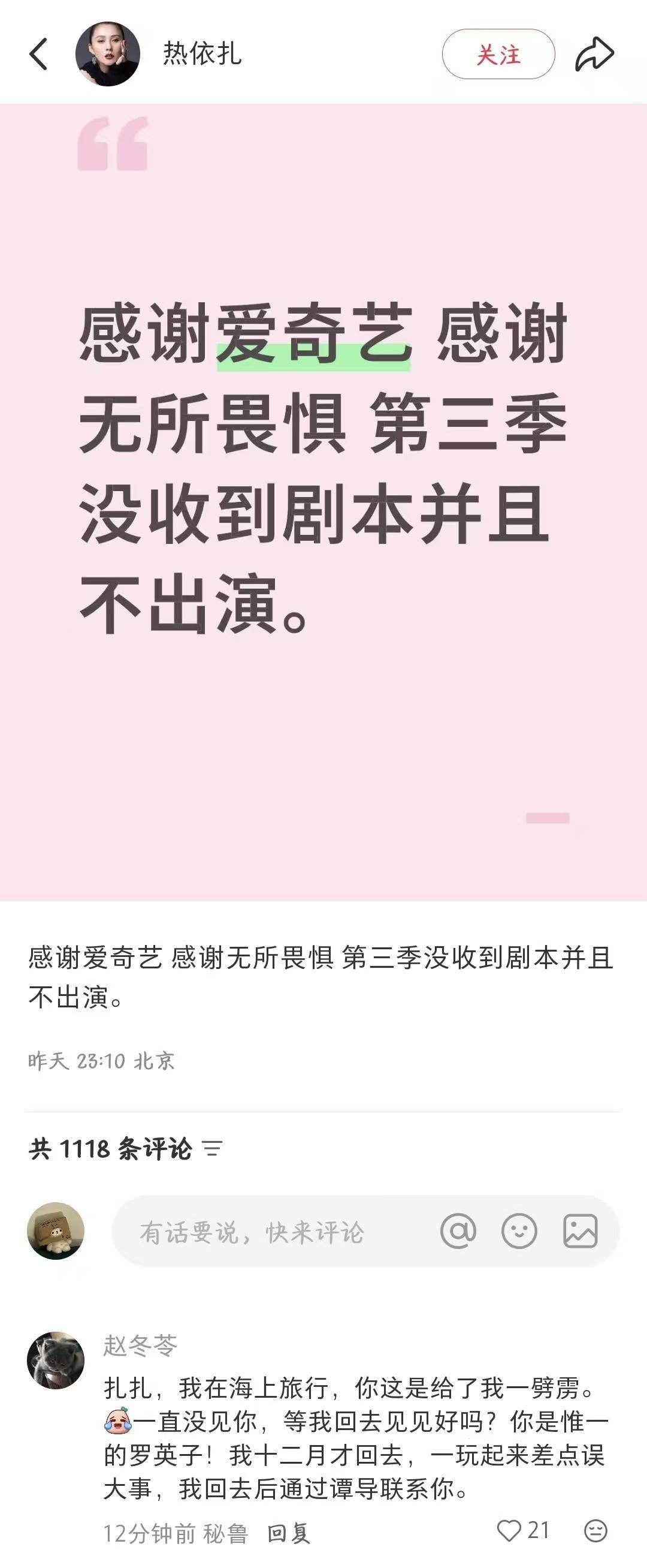 28日晨,编剧赵冬苓留言:“扎扎(热依扎),我在海上旅行,你这是给了我一霹雳。一直没见你,等我回去见见好吗?你是唯一的罗英子!我十二月才回去,一玩起来差点误大事。”IP地址显示赵冬苓此时正在秘鲁,对于为何热依扎突然发文表示不会出演《无所畏惧3》,赵冬苓表示不知情,“情况不了解,后续等我了解热依扎的事情之后再说。”