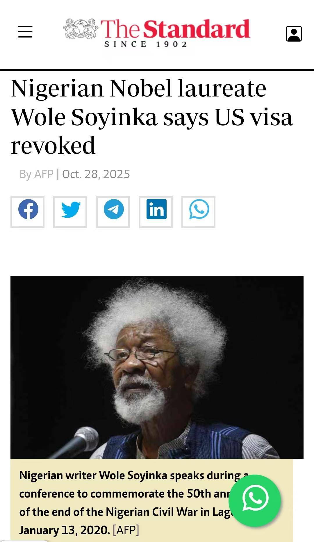 据《旗帜报》消息,非洲首位获得诺贝尔文学奖的作家沃莱·索因卡28日在新闻发布会中表示,美国驻拉各斯领事馆已经吊销了他的美国签证,此前索因卡持有美国永久居留权。