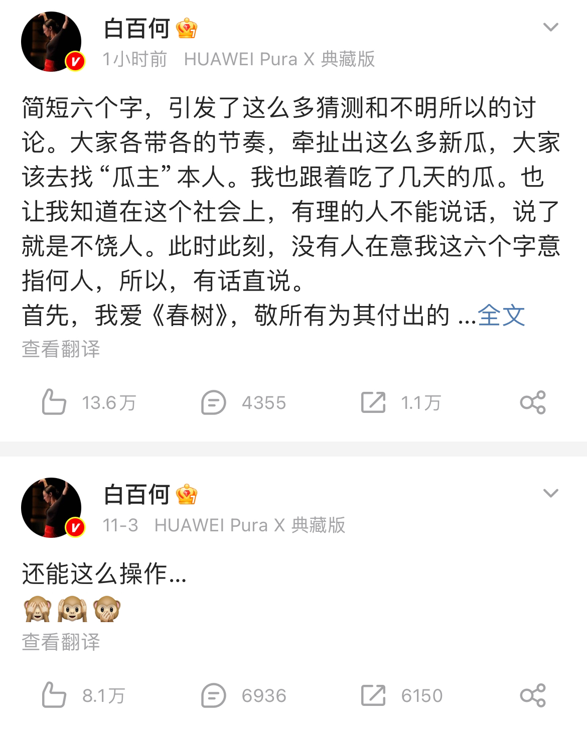 她写到:简短六个字,引发了这么多猜测和不明所以的讨论。大家各带各的节奏,牵扯出这么多新瓜,大家该去找“瓜主”本人。我也跟着吃了几天的瓜。也让我知道在这个社会上,有理的人不能说话,说了就是不饶人。此时此刻,没有人在意我这六个字意指何人,所以,有话直说。