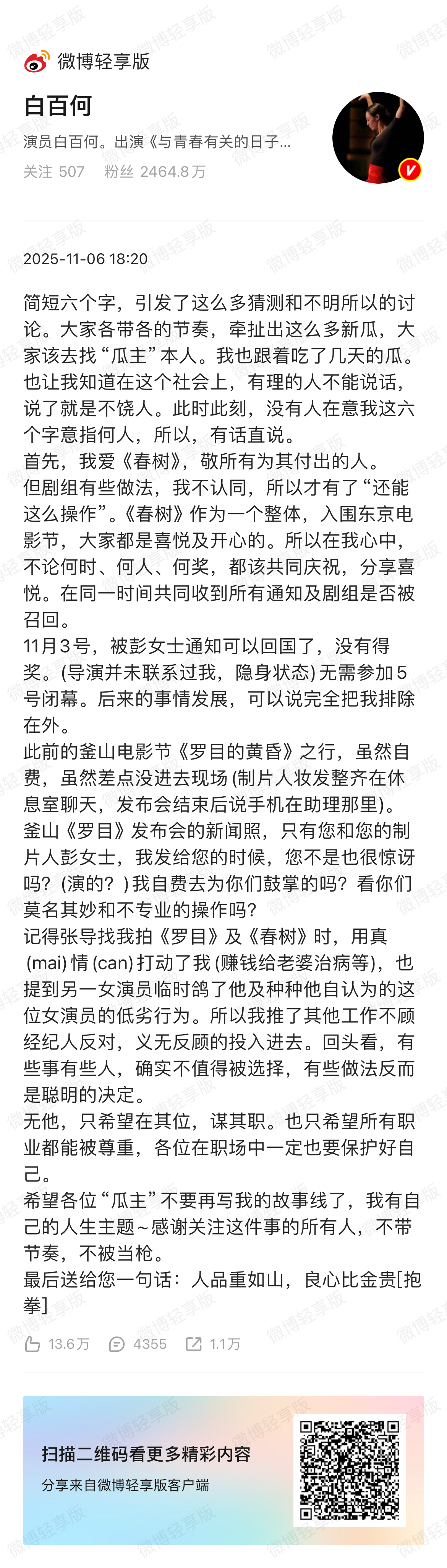 6日傍晚,演员白百何在社交平台发文,回应11月3日所发“还能这么操作”引发的争议。她表示自己对《春树》电影剧组的有些做法不认同。