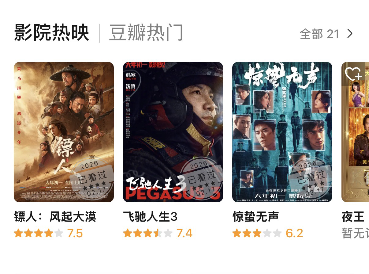 此外,记者还注意到,21日晚,春节档新片的豆瓣分也出现变化。《飞驰人生3》开分7.6,目前7.4;《镖人:风起大漠》开分7.5,目前维持不变;《星河入梦》开分7.0,目前6.9;《惊蛰无声》开分6.3,目前6.2。此外,《熊猫计划2》目前仍未开分。这样一来,《镖人》以7.5分暂时居春节档第一名。