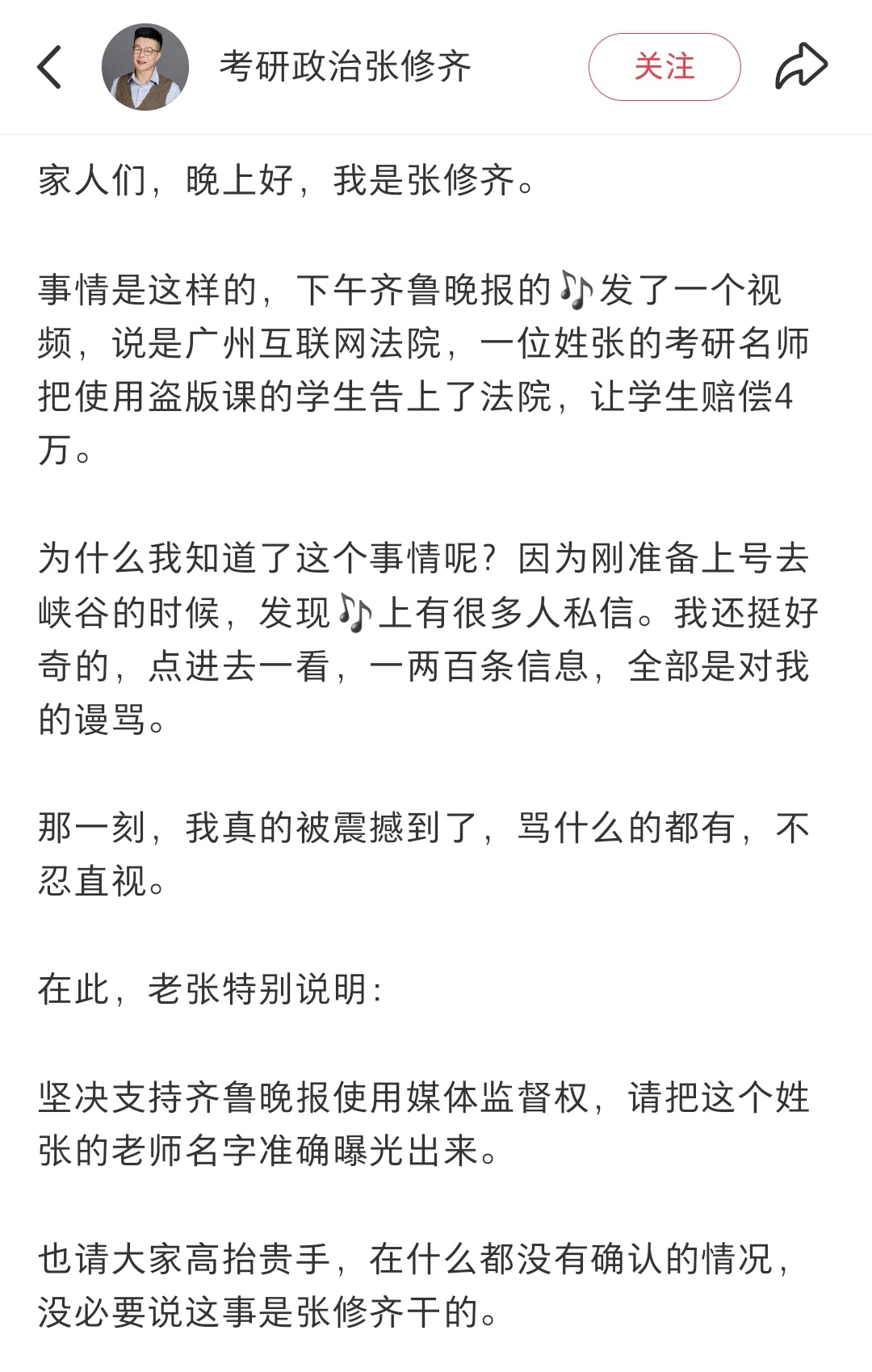 然而,事情到这里却并没有结束。苏州的考研指导老师张修齐“人在家中坐,锅从天上来”了。22日晚,张修齐在社交平台发文澄清此事,他表示自己突然发现自己账号后台涌入了百来条私信,全部都是对他的谩骂,“那一刻,我真的被震撼到了,骂什么的都有,不忍直视……请大家高抬贵手,在什么都没有确认的情况,没必要说这事是张修齐干的。”