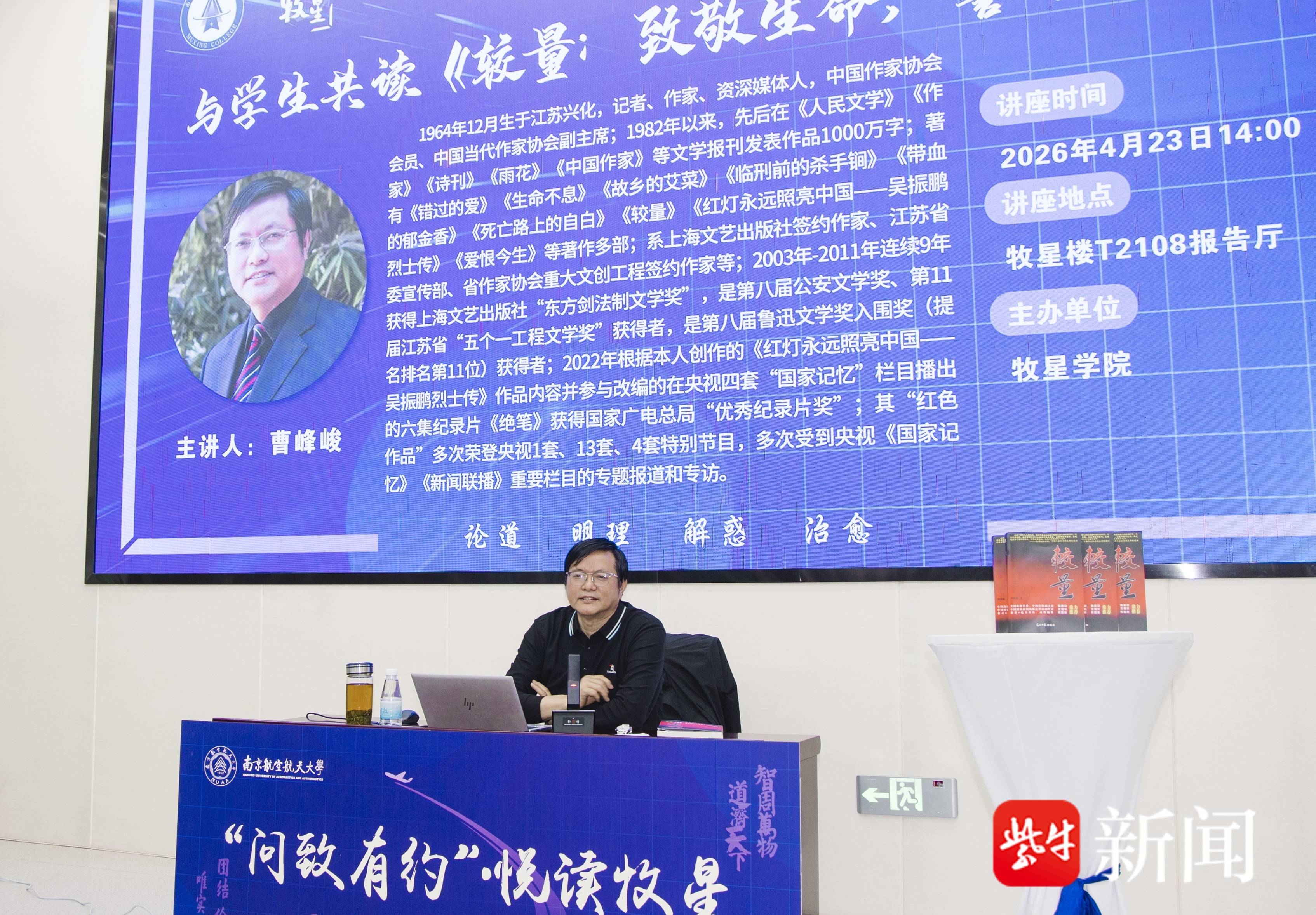 四月的南航天目湖校园,春风拂面,碧波荡漾,书香弥漫。4月23日,第31个世界读书日如约而至。一场名为《较量:致敬生命,警示人生》的阅读之约,在南京航空航天大学天目湖校区牧星楼T2-108报告厅温情启幕。中国作家协会会员、中国当代作家协会副主席、法治纪实文集《较量》的作者曹峰峻应邀来校以“致敬生命,警示人生”为题,与牧星学子共读、共思、共成长。南航牧星学院党委书记贡海俊、院长蒋彦龙出席活动,200多位师生共同见证了牧星学院第10期“问致有约”读书文化节的文化内涵与品牌魅力。讲座活动由致慧书院辅导员吴玲主持。