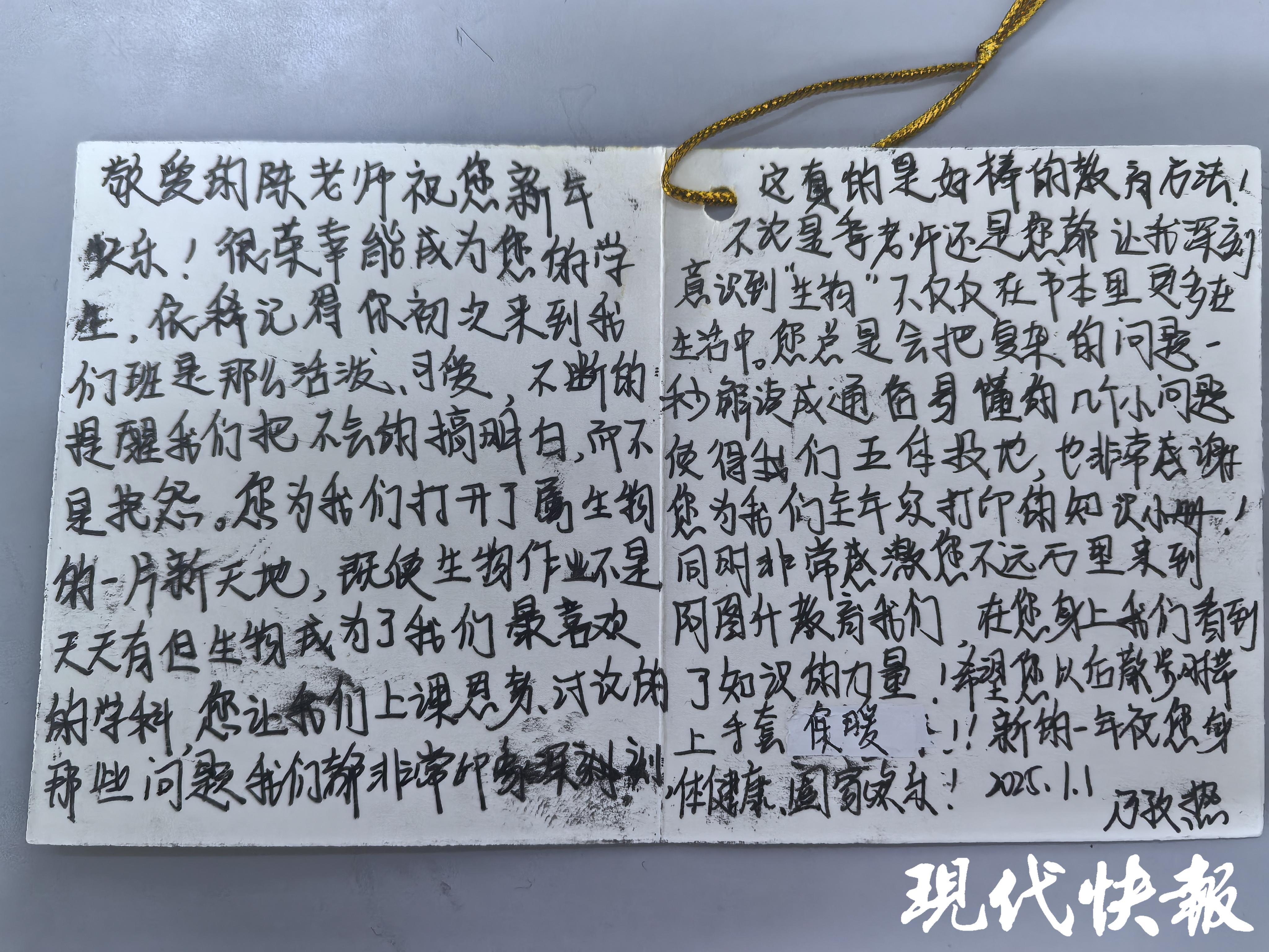 “敬爱的陈老师,依稀记得你初次来到我们班是那么活泼、可爱,不断地提醒我们把不会的搞明白,而不是抱怨。您为我们打开了属于生物的一片新天地。”“师者若水,润物无声。祝愿老师春风化雨,桃李满天下。”……来学校后,陈海波还陆续收到学生们写的感谢信。