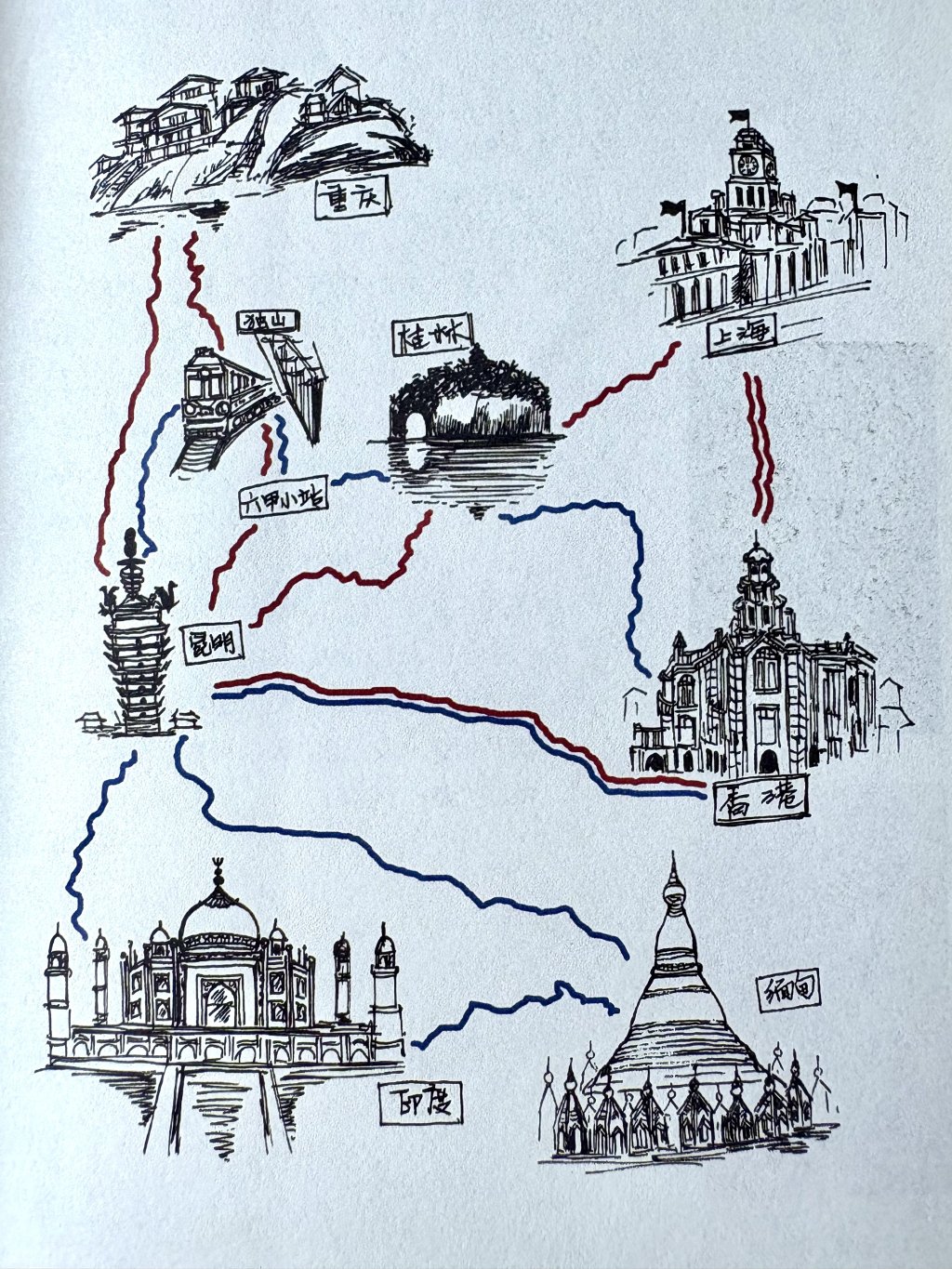 1944年-1945年,钱林保和高芳仪的行程路线图。红色线为高芳仪路线,蓝色线为钱林保路线,双红线为两人在香港结婚后共同返沪。王璇绘制,翻拍自《一个中国远征军翻译官的爱情书简》