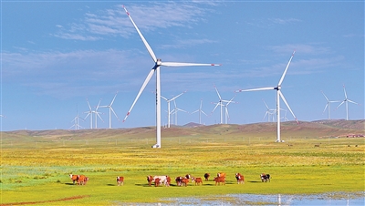 内蒙古自治区乌兰察布市,风力发电机将风能转化为绿色电能。 宋卫星摄(人民视觉) |