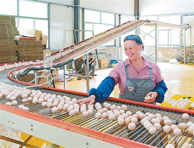 贵州省晴隆县,东西部协作项目资金支持的一家蛋鸡养殖场内,工人在分拣鸡蛋。 贾 智摄(影像中国) |