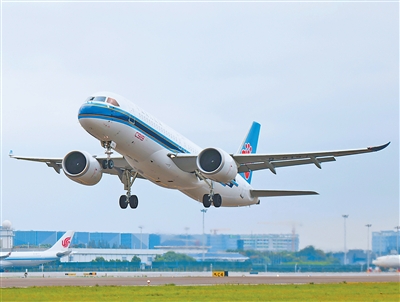 浙江省杭州市,南航国产C919客机从萧山国际机场起飞,飞往广东广州。C919实现从首飞到首航,再到常态化商业运营,目前累计获得国内外订单超1000架。 龙 巍摄(影像中国) |