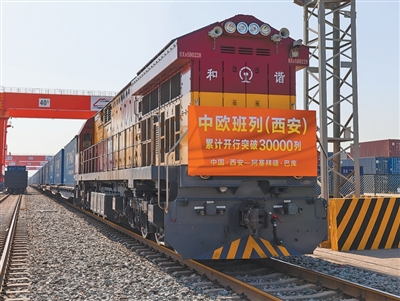 陕西省西安市,满载光伏组件的中欧班列从西安国际港站驶出。 杨静龙摄(影像中国) |
