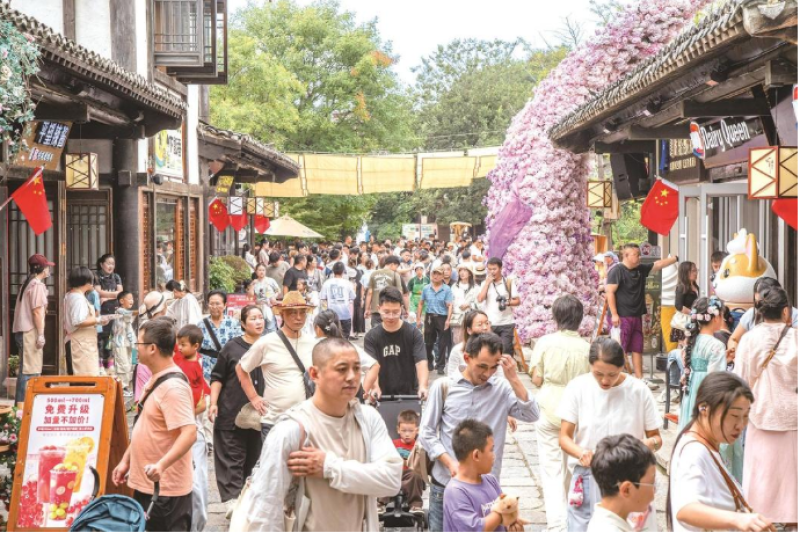全市各主力景区亦通过迭代升级实现客流与营收双增长:东方盐湖城新推“灵宠乐园”,带动客流同比上涨70%,营收增长25%,假期7天满房;南山竹海“萌宠登山赛”、茅山森林世界“小熊猫庄园”等携宠体验深受亲子家庭欢迎,其中茅山森林世界8天客流总量同比翻番;迪诺水镇“十三太饱美食争霸市集”、天宁胜境“自在漫步生活季”等融合文化和时尚元素,成为市民游客打卡热门地;天目湖“秋捕季”、洑家村“晒秋市集”等特色赏秋项目吸引大量周边游客,消费潜力得到深度释放。