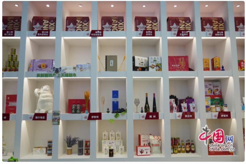 ▲“军垦之星”数创基地展示的全疆各地优质农产品。中国网记者 胡俊 摄