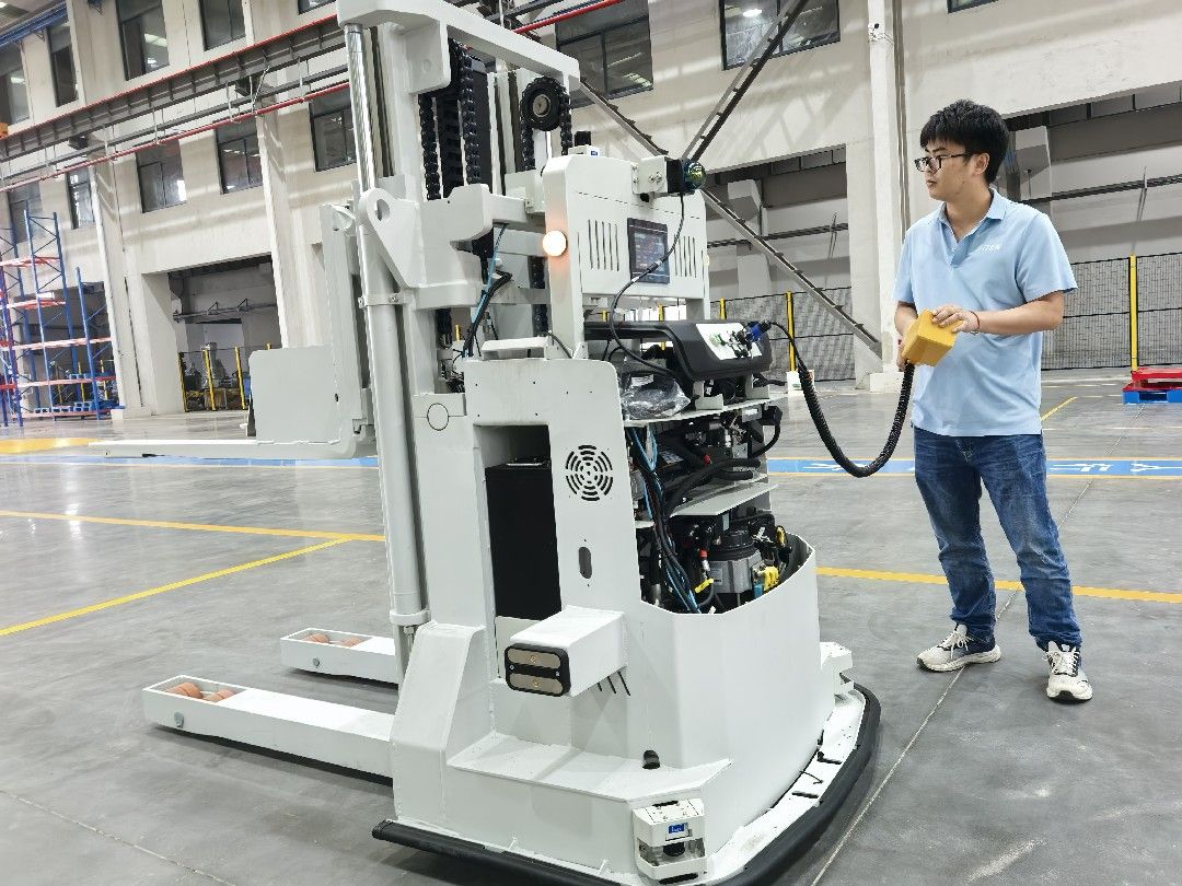 在海豚之星公司琳琅满目的机器人方阵中,一台“大块头”格外引人注目。“这款出口日本的全向车‘身高’达3.3米,‘体重’为2.5吨,能轻松举升1.5吨的重物,举高达3.3米。”孙雨佳介绍,这台智能设备还可以实现多角度精准移动,并配备称重模块,堪称智能搬运界的“大力士”。