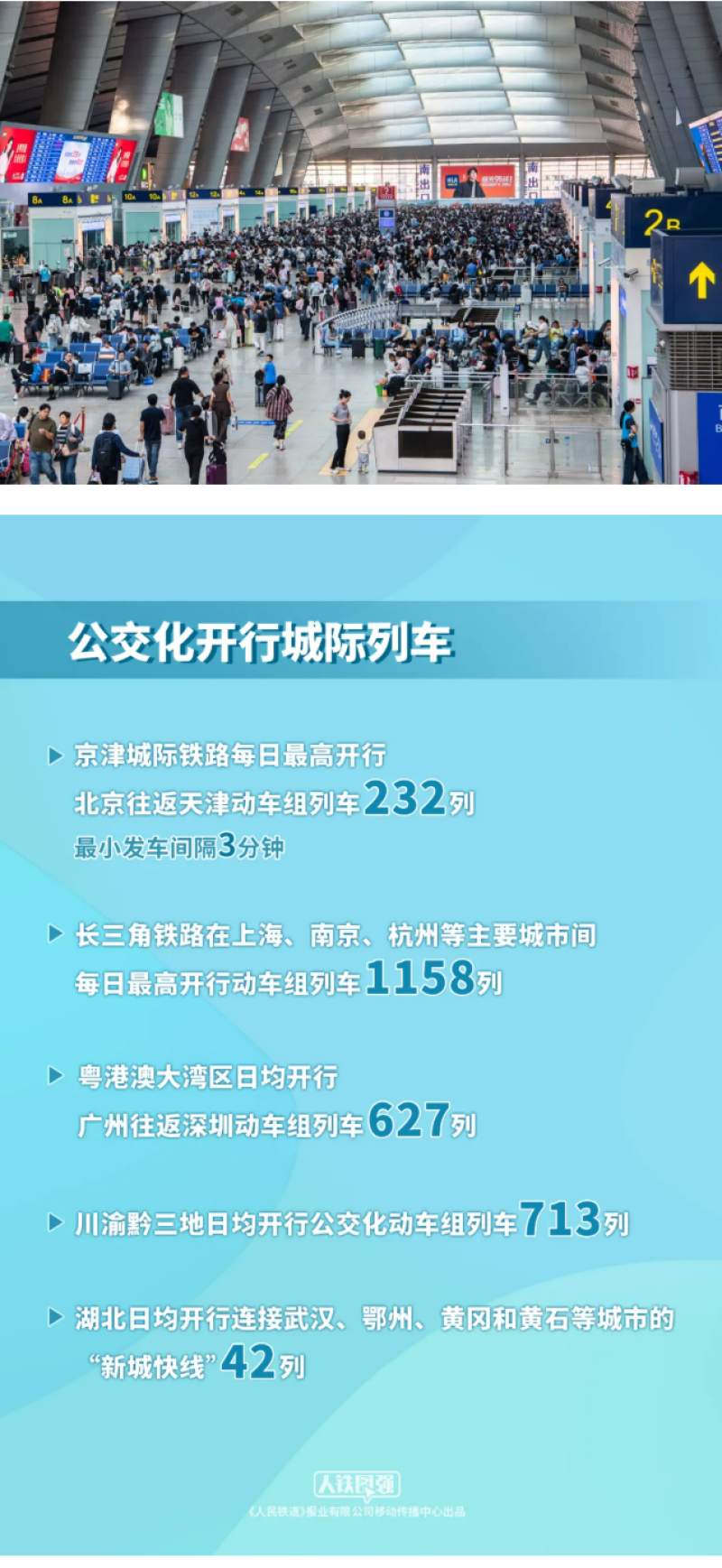 三是公交化开行城际列车。在通勤、短途游需求较旺盛的京津冀、长三角、粤港澳大湾区、成渝等地区安排公交化开行城际列车,构建半小时、1小时交通圈,催生同城化效应,京津城际铁路每日最高开行北京往返天津动车组列车232列,最小发车间隔3分钟,长三角铁路在上海、南京、杭州等主要城市间每日最高开行动车组列车1158列,粤港澳大湾区日均开行广州往返深圳动车组列车627列,川渝黔三地日均开行公交化动车组列车713列,湖北日均开行连接武汉、鄂州、黄冈和黄石等城市的“新城快线”42列。
