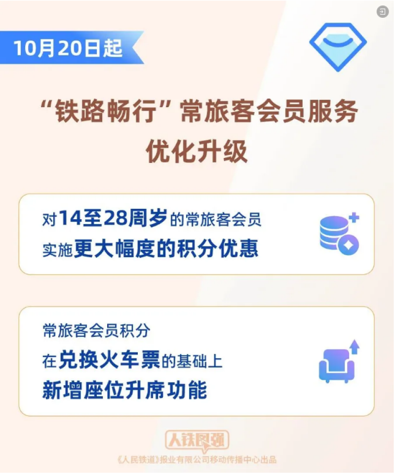 四是优化升级“铁路畅行”常旅客会员服务。年满60周岁的老年常旅客会员购票乘车可获票面金额15倍的积分,14至28周岁的常旅客会员购票乘车可获票面金额10倍的积分,分别为普通常旅客会员的3倍、2倍,积分在可用于兑换火车票的基础上,新增办理座位升席。