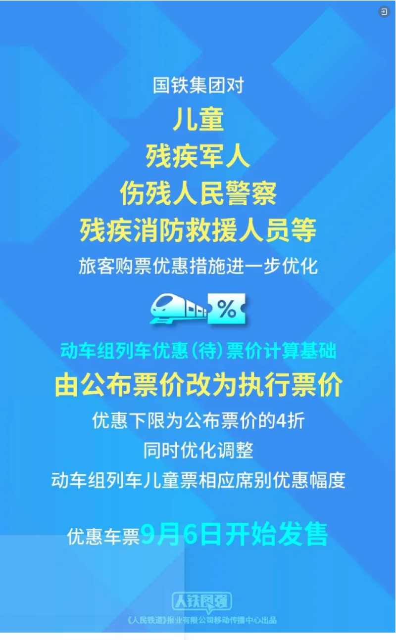 六是特殊群体旅客动车组列车票价可享受“折上折”。优化学生、儿童、残疾军人、伤残人民警察、残疾消防救援人员等特殊群体旅客购票优惠措施,动车组列车优惠(待)票价计算基础由公布票价改为执行票价,优惠下限为公布票价的4折,上述群体旅客将享受到更多票价优惠。