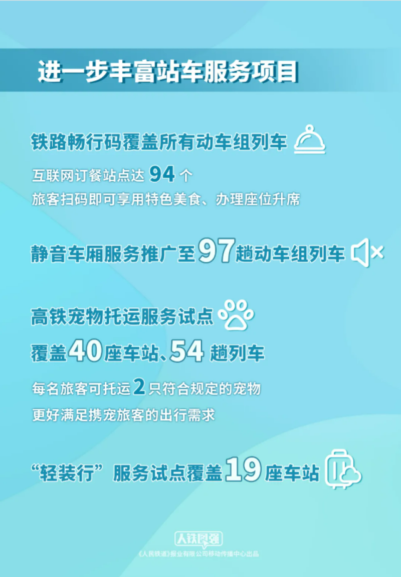八是进一步丰富站车服务项目。铁路畅行码覆盖所有动车组列车,互联网订餐站点达94个,旅客扫码即可享用特色美食、办理座位升席;静音车厢服务推广至97趟动车组列车;高铁宠物托运服务试点覆盖40座车站、54趟列车,每名旅客可托运2只符合规定的宠物,更好满足携宠旅客的出行需求;“轻装行”服务试点覆盖19座车站,为旅客提供“门到站”“站到门”同城行李搬运服务,有效减轻旅客出行负担。