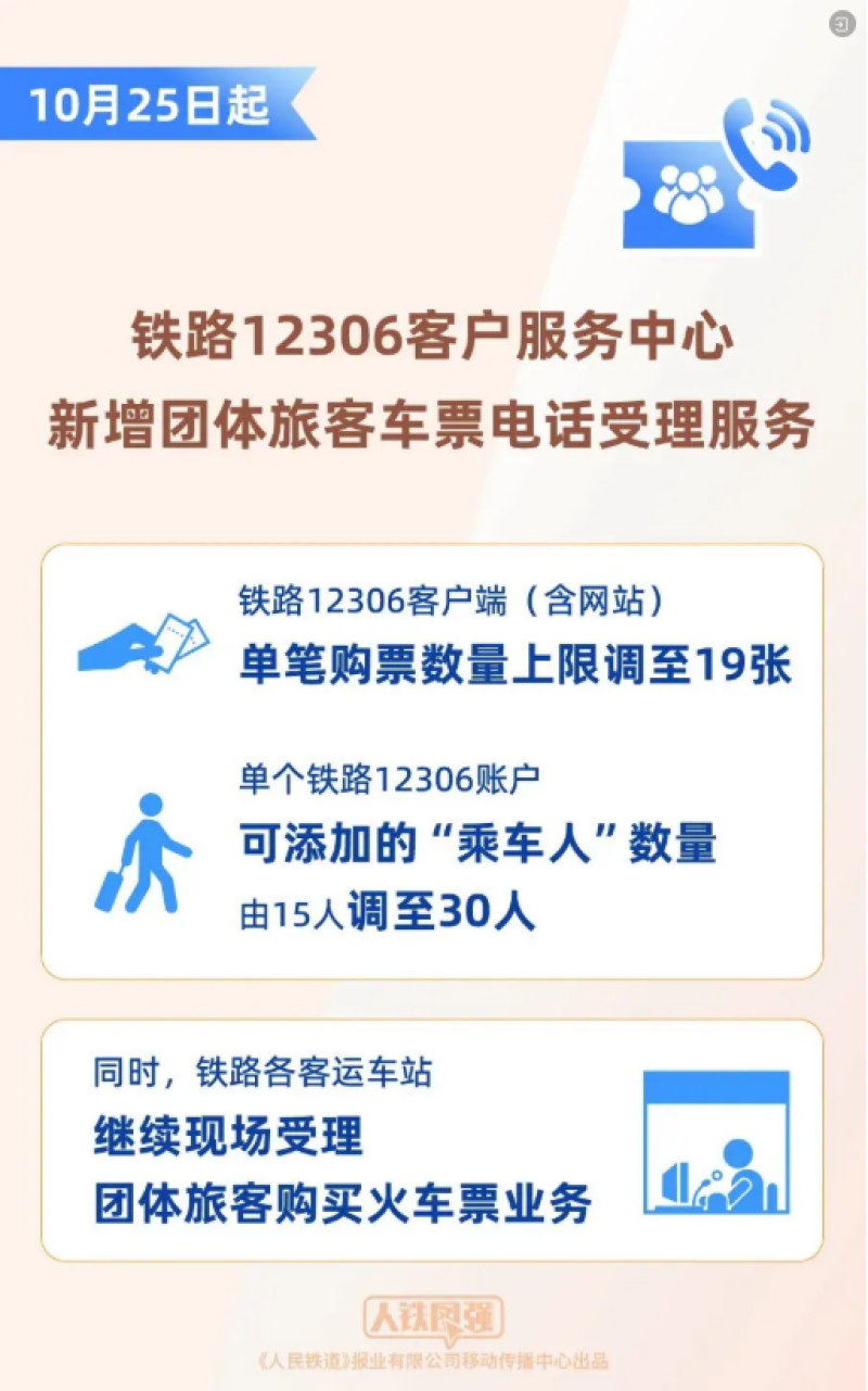 九是增加团体票电话受理服务。铁路12306客户服务中心新增团体票电话受理服务,铁路12306客户端(含网站)单笔购票数量上限调至19张,单个铁路12306账户可添加的“乘车人”数量由15人调至30人,铁路各客运车站继续现场受理团体旅客购买火车票业务,各类旅游、研学、演出、赛事等团体旅客集中购票出行更加方便。