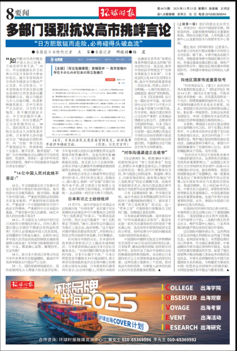 日本《东京新闻》近日在一篇社论中写道,高市的涉台言论无异于公开表示日本会毫不犹豫与中国开战。作为首相,她是否意识到自己言论的严重性?此类煽动情感对立的言行,会损害双方的国家利益。日本《每日新闻》则在社论中写道,高市首相一直以来都以其直言不讳的言论而受到保守派选民的欢迎,但她同时也应该意识到,不谨慎的言论可能会引发外交局势紧张。