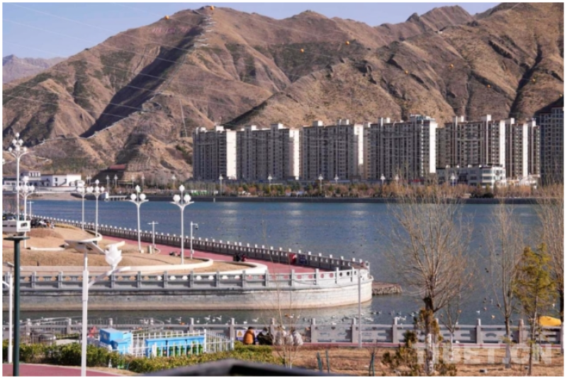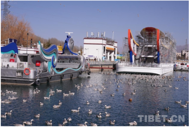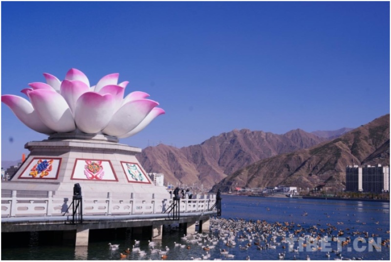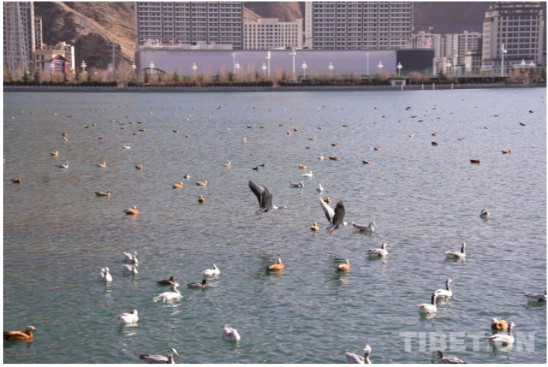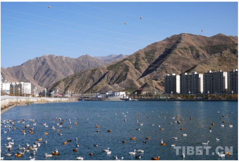 现代化的城市楼宇与连绵的群山相依,成群的斑头雁、赤麻鸭在拉萨河中游弋,勾勒出人与自然和谐共生的高原图景。 摄影:张艺彤