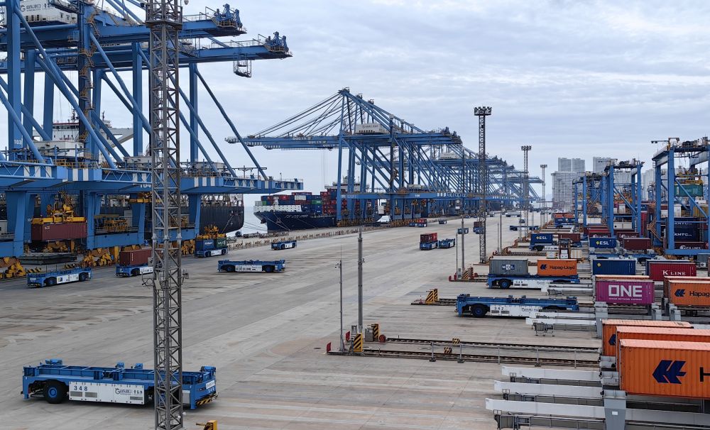 智能化创新持续赋能日照港生产调度、物流服务等关键环节。日照港建成全球首个顺岸开放式全自动化集装箱码头,42台自动化双悬臂轨道吊快速移动,50台智能导引运输车穿梭不息。这里平均每5秒钟就有一个集装箱起落的作业效率,向世界诉说着中国港口服务全球航运的科技硬实力。