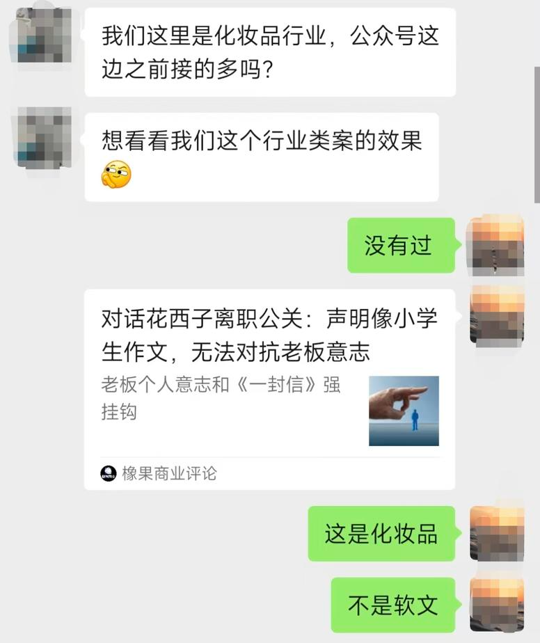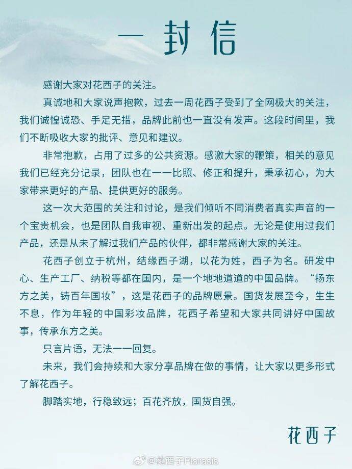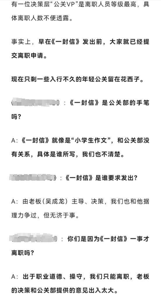 文章中称,外界普遍认为《一封信》是极其失败的公关案例,有消息称《一封信》并非出自花西子公关部之手,公关部已有员工主动辞职。一位不愿透露姓名的花西子离职公关A,表示离职一事属实。“早在信发出前,大家就已提交离职申请。现在只剩一些入行不久的年轻公关……”“《一封信》就像是‘小学生作文’,和公关部没有关系”……