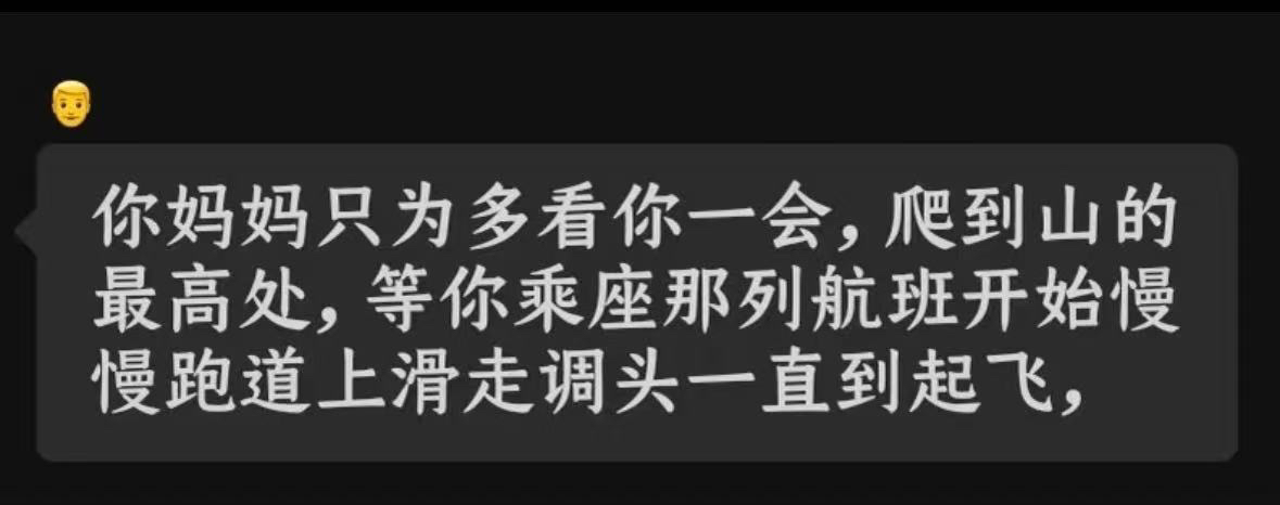 惠小姐说,今天他还收到爸爸的信息,写道“你妈妈只为你多看你一会,爬到山的最高处,等你乘坐那架航班开始慢慢跑道上滑走掉头一直到起飞。”一句简单的话,却让人又一次感动。她回忆,当时她第一时间把视频发在家庭群中说,在空中拍到你了。